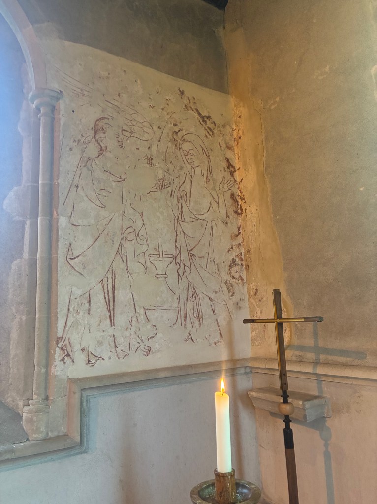 Where these murals have survived, it is frequently just the reds and reddish browns which can be seen today. One such example in this area is in St Michael’s, Enborne where there is a painting of the Annunciation at the east end of the north wall. What other paintings have been lost we shall never know.