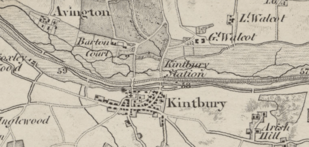 Mid C19th OS map showing Kintbury station . Note the main route into Kintbury from the north runs past Barton Court and down the Avenue.
