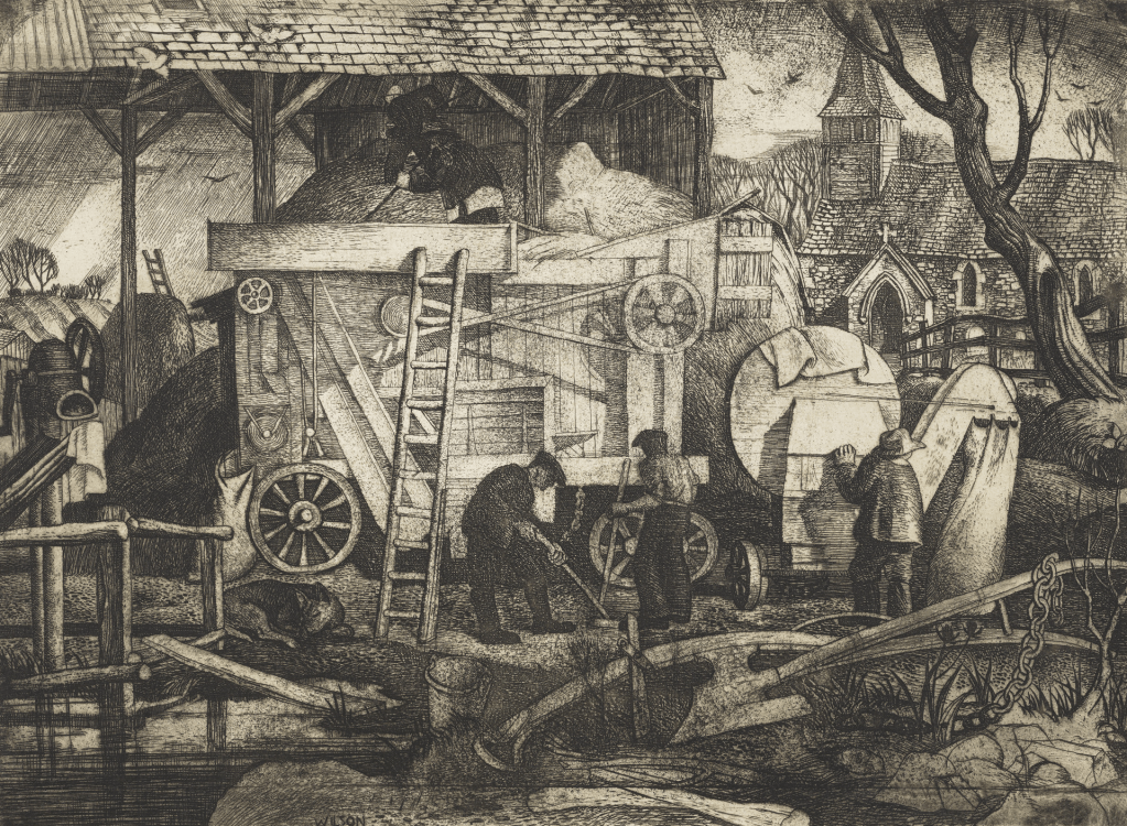 Threshing is the process of separating the grains of wheat from the chaff. Before the introduction of threshing machines, this was a very labour intensive process done by hand using a flail. Threshing took place in the autumn after the harvest had been brought in and provided employment for hard-pressed agricultural labourers at a time in the year when there was very little other farm work available. At a time when wages were lower than ever and the price of bread increasing, what the farm labourer could earn by threshing helped to keep him and his family throughout the bleakest part of the winter.