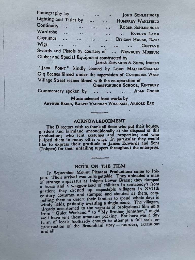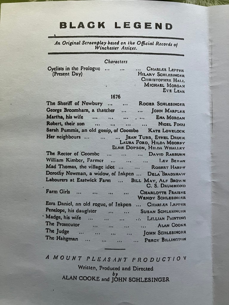 Entitled, Black Legend, the film used actors drawn from, variously, members of Oxford University Dramatic Society, one young director’s family who lived locally, villagers from Inkpen & Combe and children from Christchurch School, Kintbury.